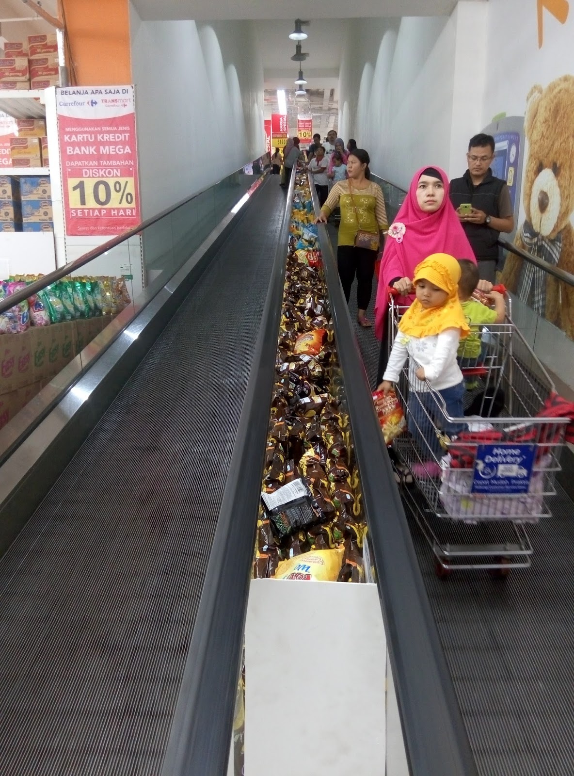 Iya. Cemilan dalam kemasan (entah namanya apa). Ratusan hingga ribuan snack ditumpahkan ditengah, kiri dan kanan eskalator yang sedang berjalan. Terlihat mereka yang menggunakan eskalator excited dan mulai menyentuh berbagai merek sepanjang perjalanan. Sebagian terlihat mengambil dan langsung memakannya.